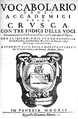 Das berühmteste und wegweisende Werk der Accademia war das „Vocabulario degli Accademici della Crusca", der erste lexikalischer Index aller italienischen Wörter. Der Anstoß für dieses Werk kam von Leonardo Salviati (1539 – 1589) persönlich, der ein Wörterbuch schaffen wollte, in dem zwischen dem „Guten und dem Schlechten" unterschieden werden sollte2.